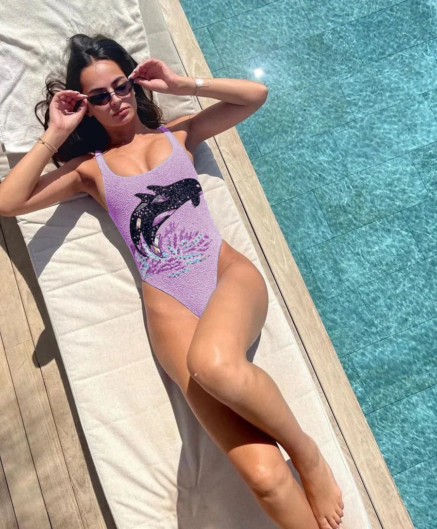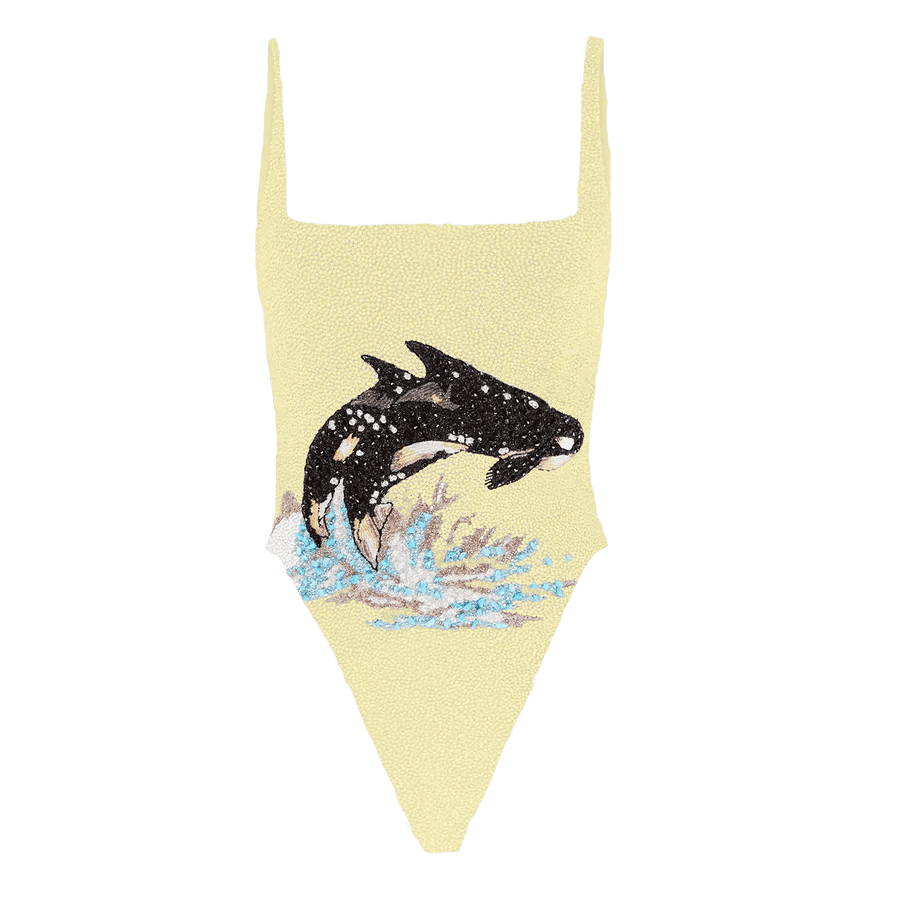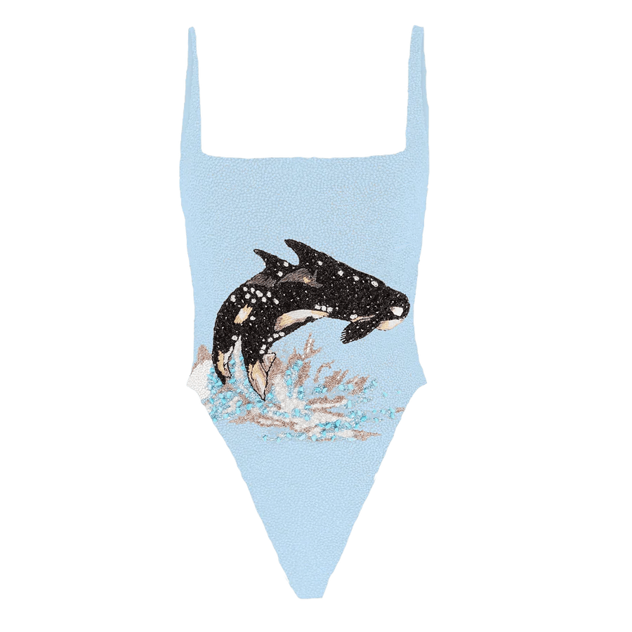 The most glamorous swimsuit we have- with its killer beaded embellishment you are sure to stand out from the crowd. The retro square neckline and sultry high cut leg allow the killer whale motif to stand out.