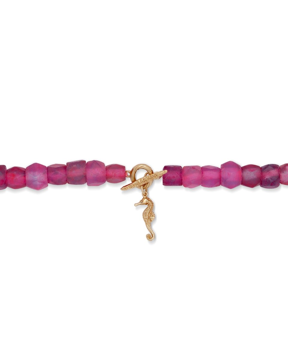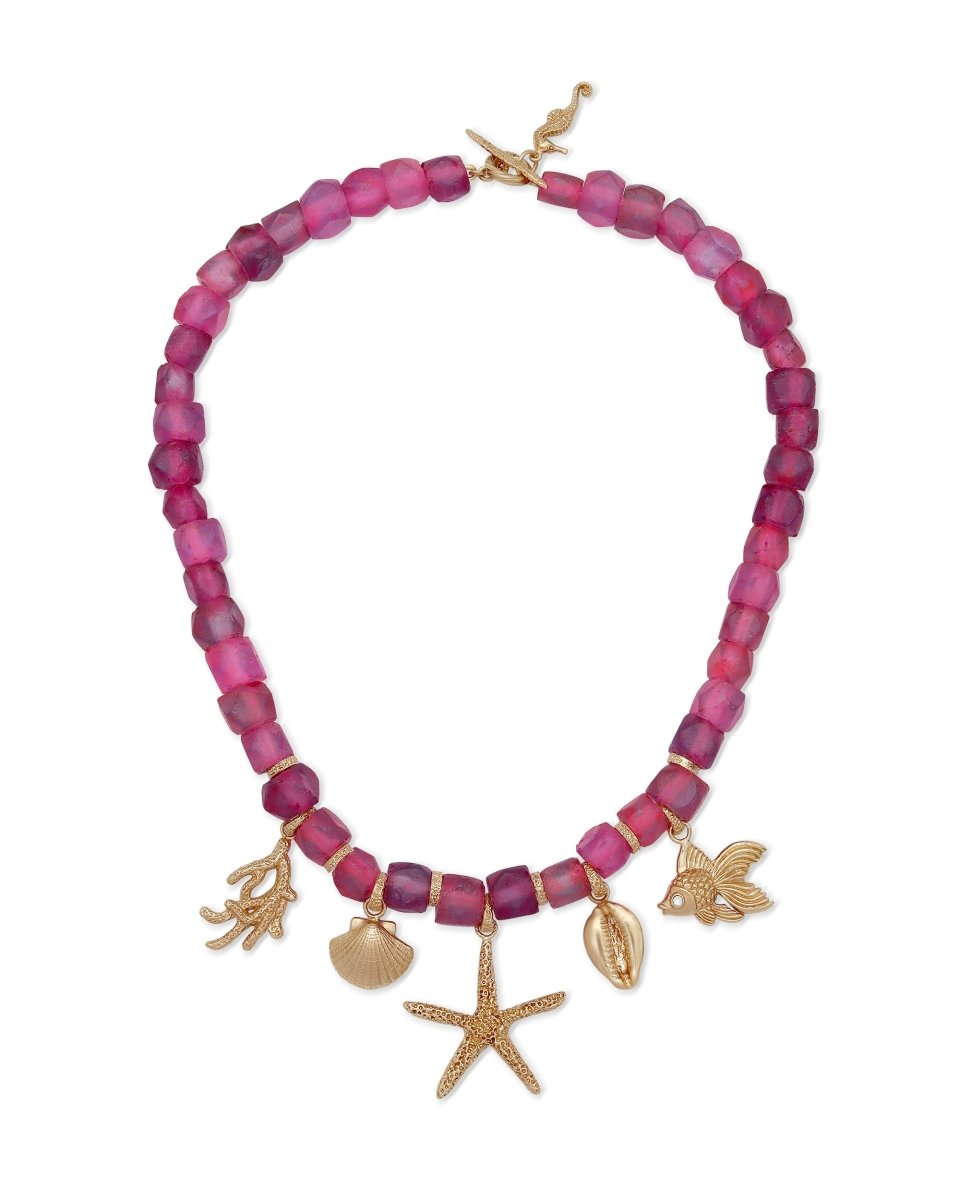 Fun and vibrant pink beaded necklace featuring gold ocean-themed charms (starfish, seashell, coral). A playful summer statement necklace perfect for tropical vacations and coastal party looks.