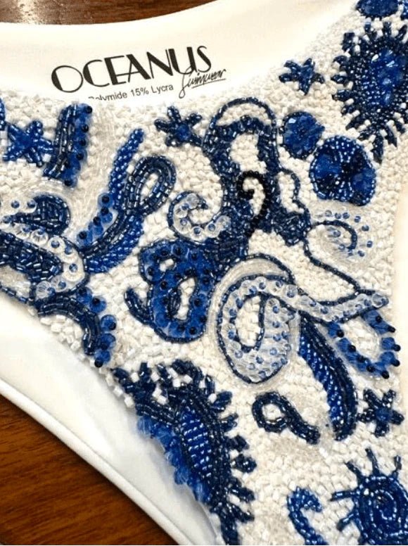 Embrace your feminine elegance with the hand beaded Sea Horse White Bikini. This exquisite two-piece features a delicately hand-beaded design. With it’s timeless silhouette, it offers a flawless fit, making it the perfect choice for sun-soaked beach days, poolside relaxation, or luxurious getaways.