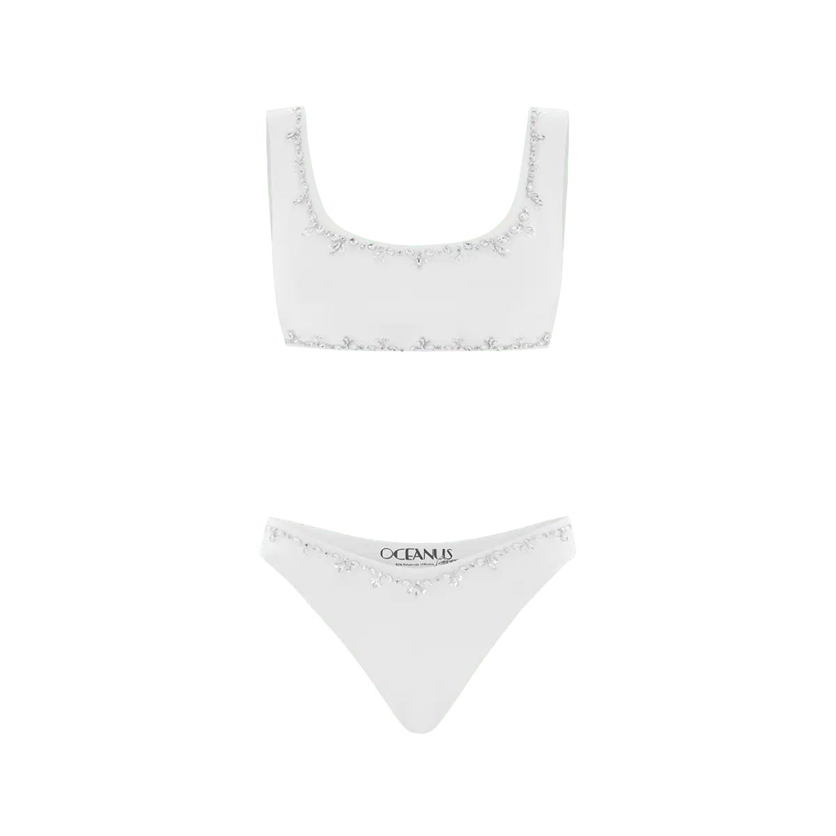 AALIYAH is a classic Oceanus design which features hand-embroidery crystal trims to the top and pants. Made from butter-soft eco-friendly Italian lycra, all you need is a summer tan