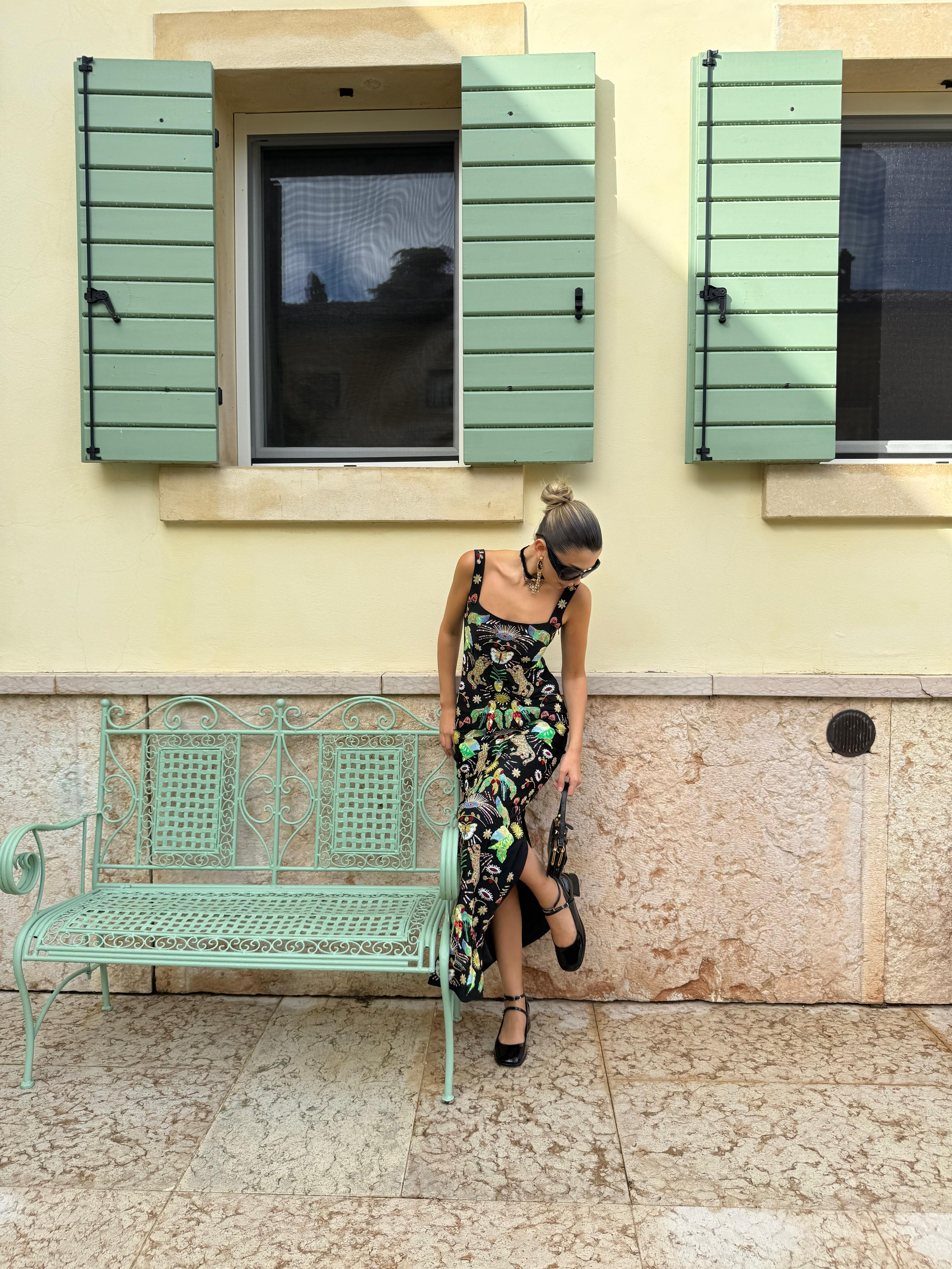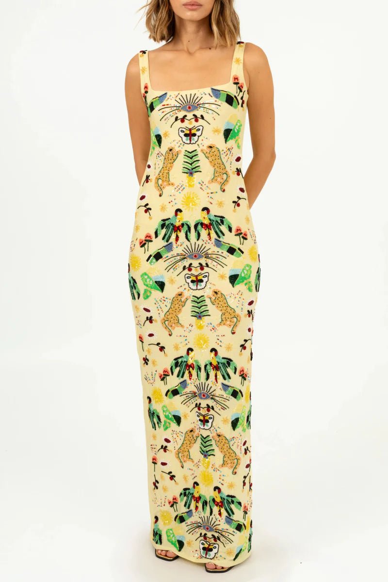 Our bestselling Aurelia dress in a maxi dress, adorned with tropical motifs.