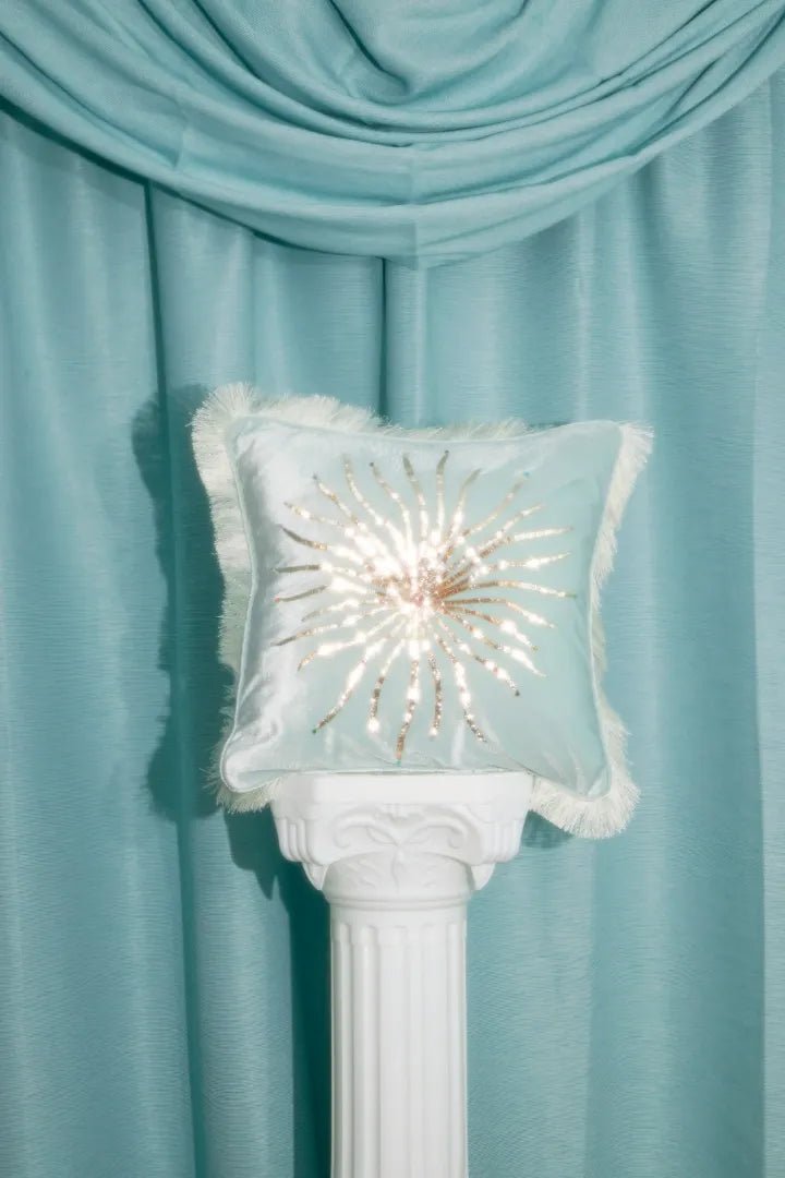 Oceanus' signature Callie embelishment hand embroidered on a soft blue velvet. Size - 16 x 16