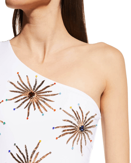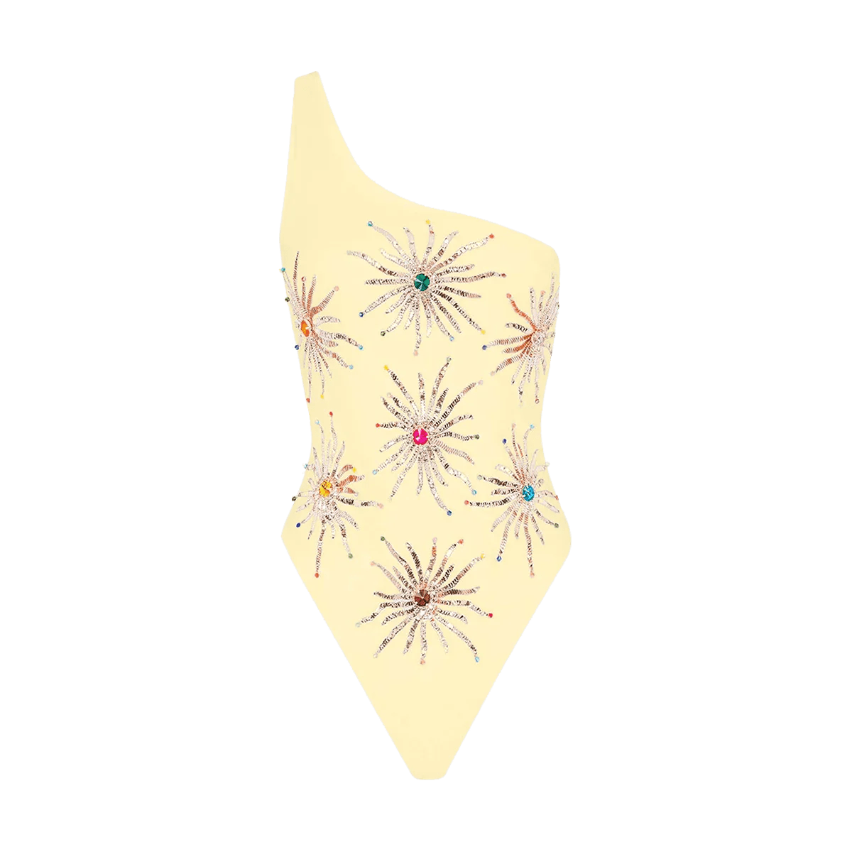 The CALLIE swimsuit is the ultimate statement swimsuit! Featuring hand embroidered gold bullion starbursts, finished with crystal elements. Layer with lots of gold jewellery and a floppy raffia hat to draw all of the attention poolside.