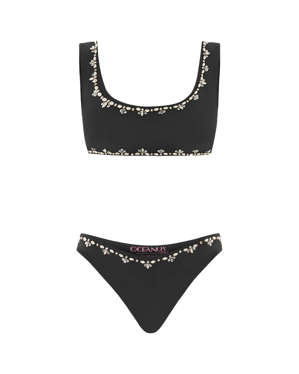 AALIYAH is a classic Oceanus design which features hand-embroidery crystal trims to the top and pants. Made from butter-soft eco-friendly Italian lycra, all you need is a summer tan