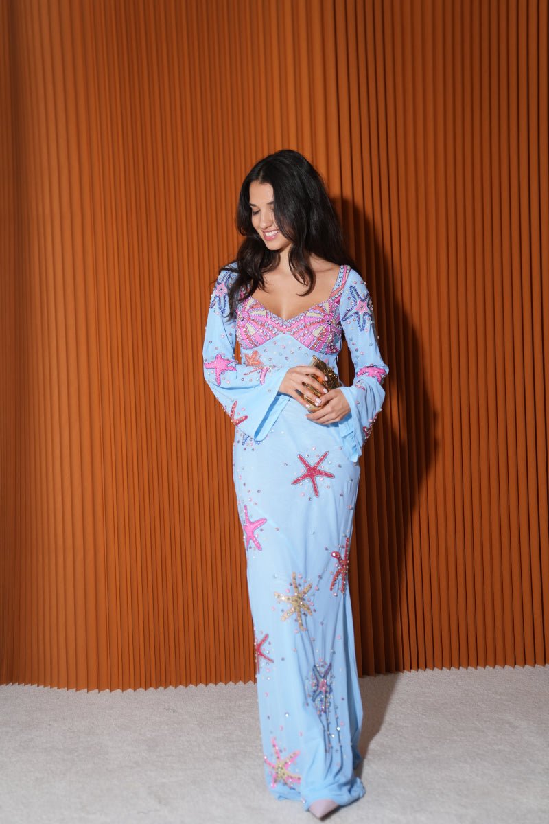 Introducing our new Crescent Shell maxi dress with beautiful bell sleeves - hand adorned with intricate hand-beaded details.