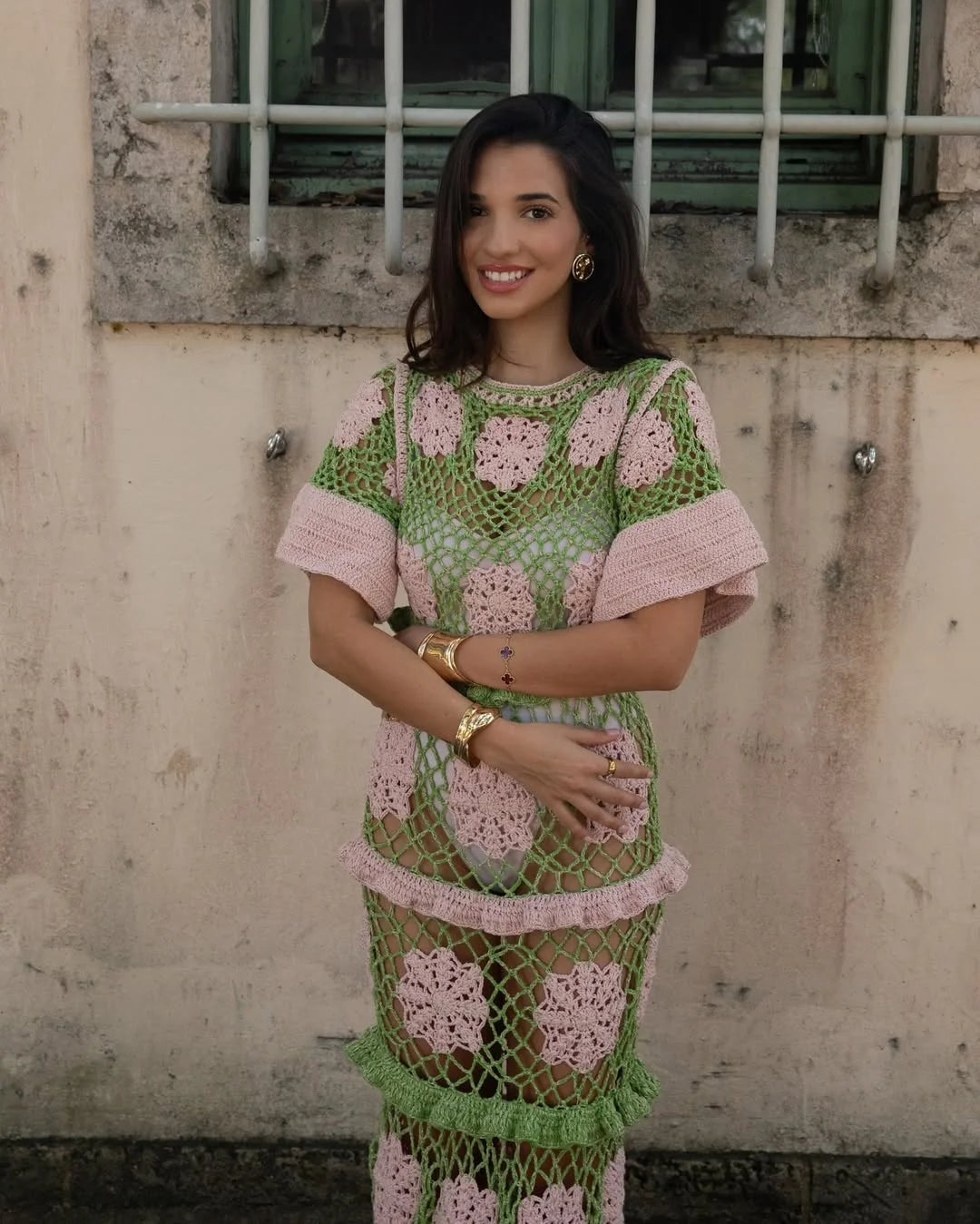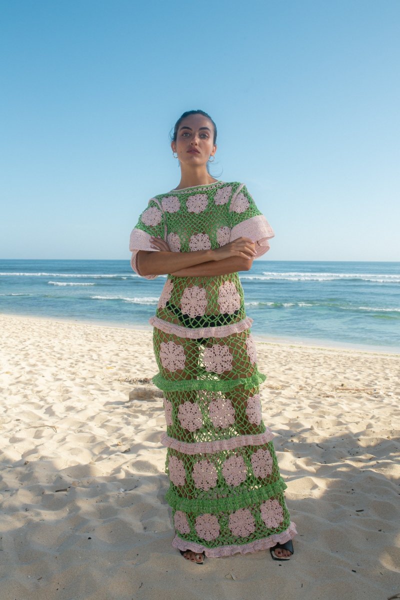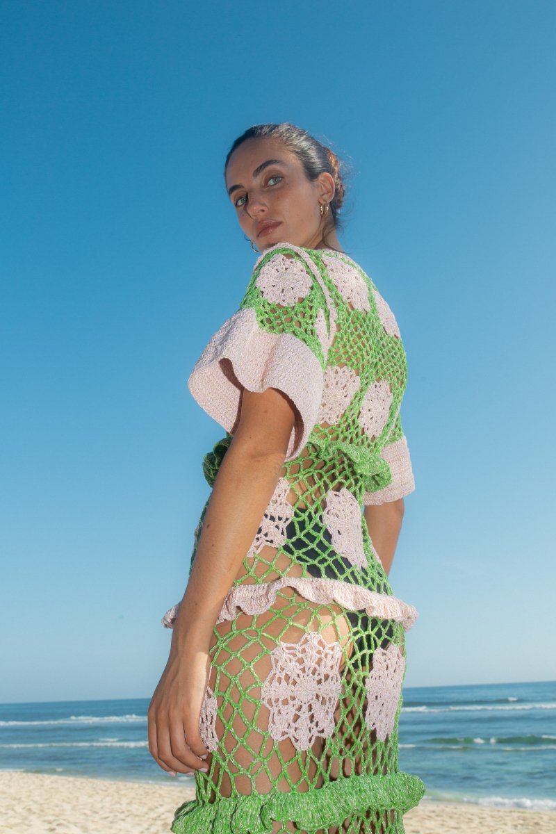 The Elle Dress is Crafted with 100% cotton and is Crochet with white patterns over a green base. This is the perfect piece to put on over your bikini when going to and from the beach.