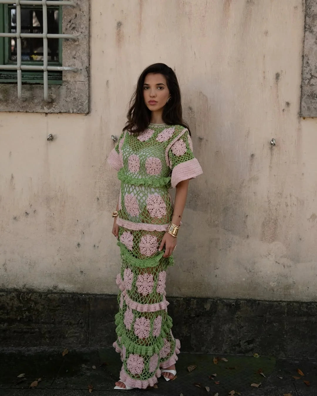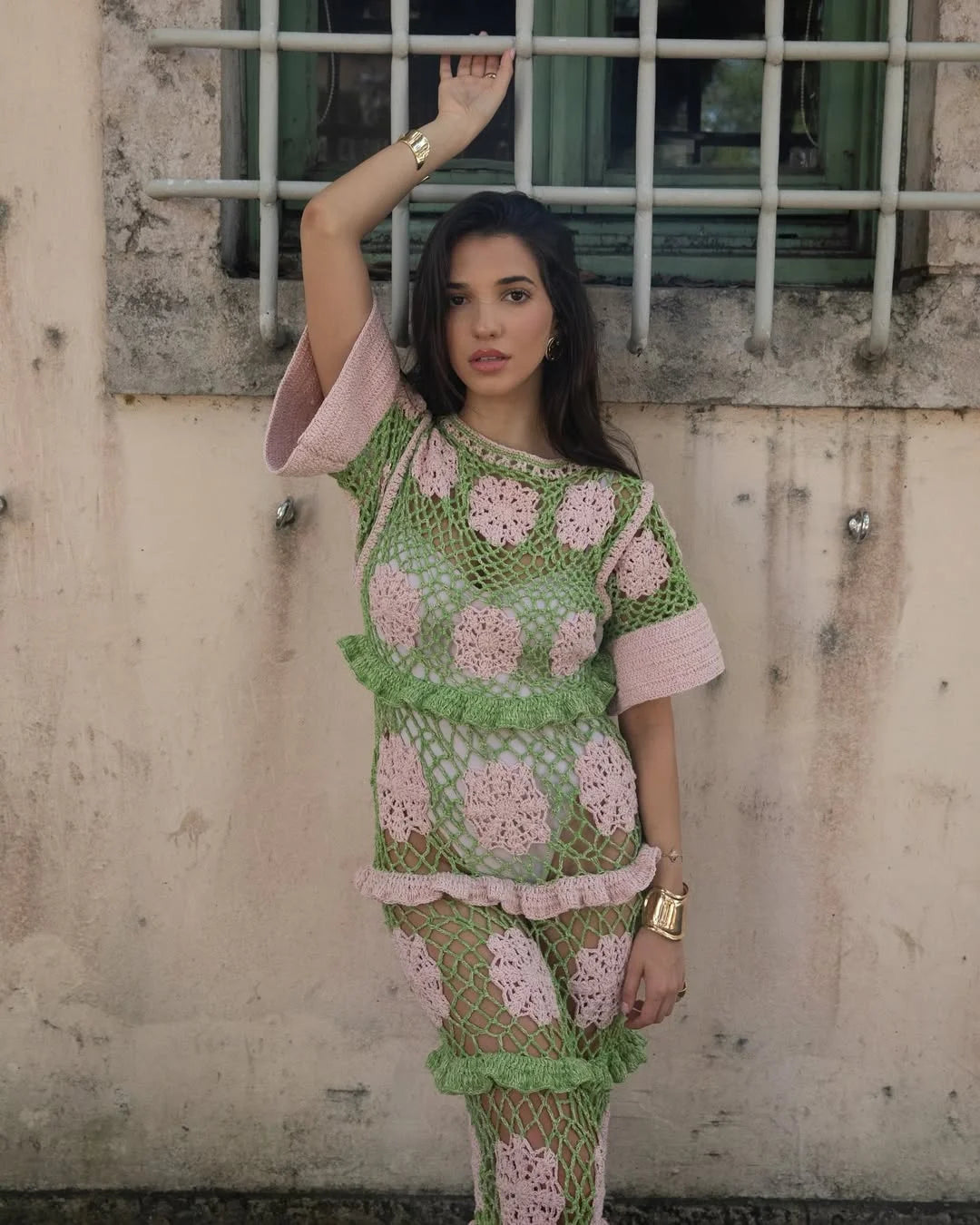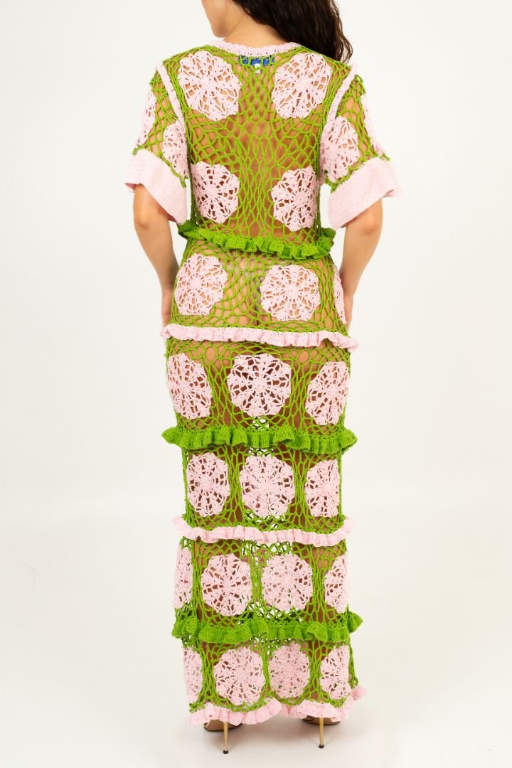 The Elle Dress is Crafted with 100% cotton and is Crochet with white patterns over a green base. This is the perfect piece to put on over your bikini when going to and from the beach.