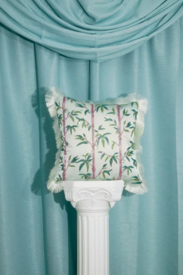 Poodle & Blonde's signature money tree print updated with Oceanus flair. Hand embroidered on a soft mint silk with delicate fringe trim. Size - 16 x 16