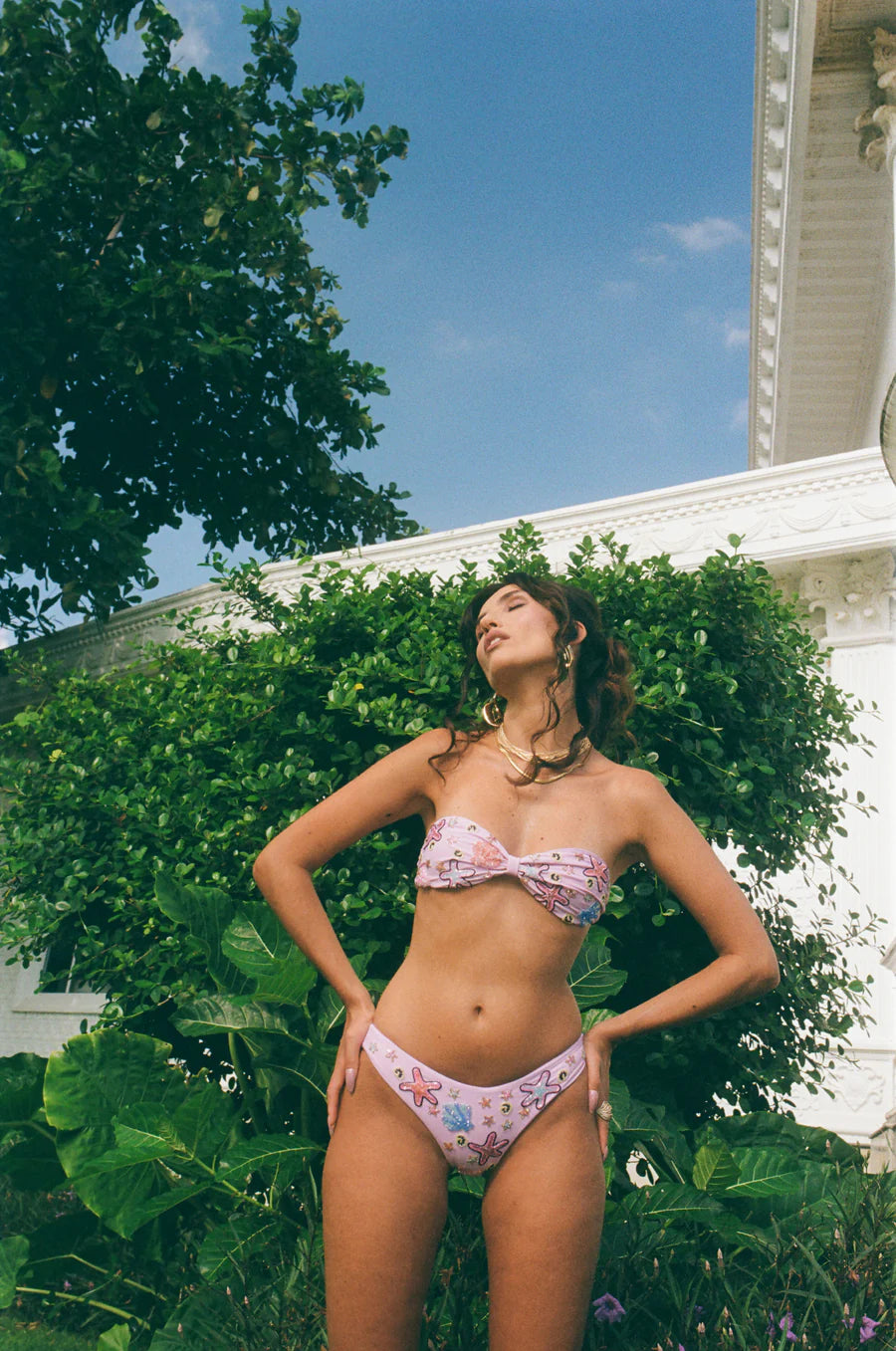 Introducing Quinn - our new hand embroidered bikini. This bikini top has clasp closure at the back. Entirely hand embroidered with our signature new design inspired by our founder Hannah's new home in the tropics. This lilac dream is your passport to paradise, featuring enchanting starfish and shell motifs.