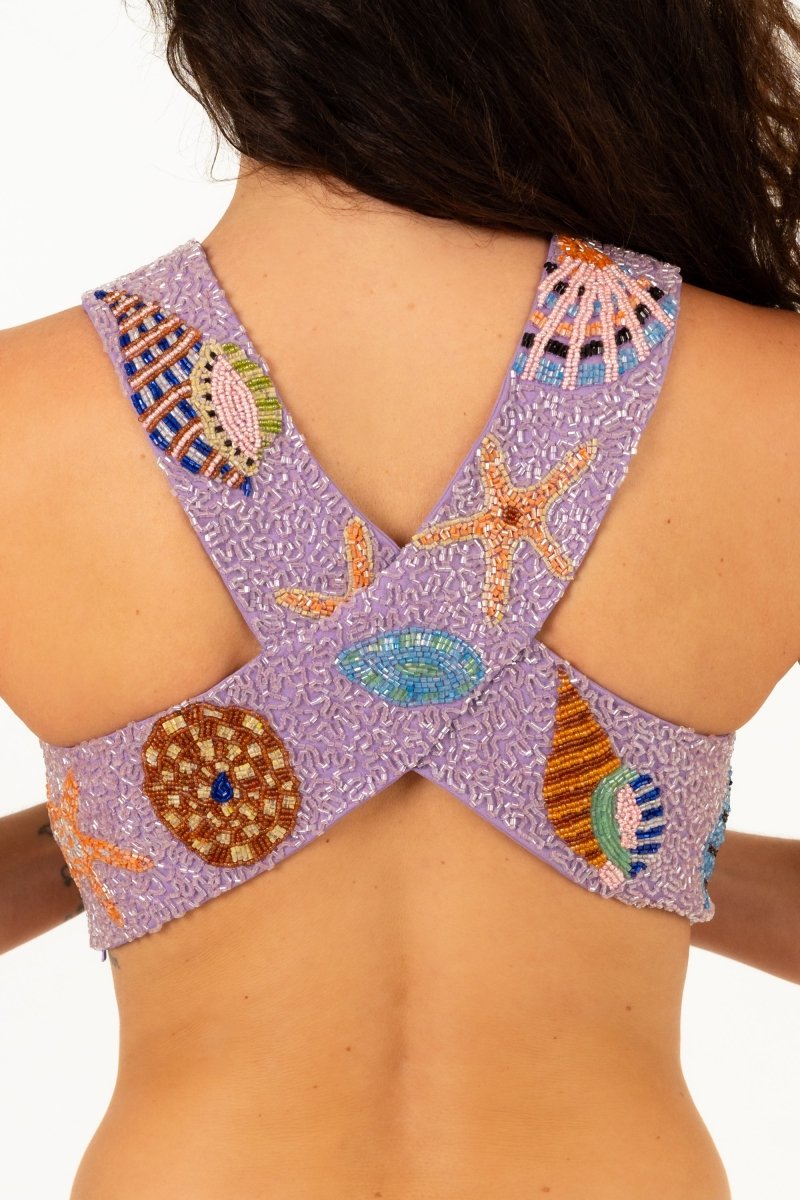 A statement in craftsmanship and sparkle, the Seahorse Co-ord Criss Cross Top in Purple is designed to captivate. Handcrafted to order in London, this top features Oceanus’s signature crystal beading, catching the light from every angle. The criss-cross silhouette flatters the figure, making it the perfect piece to pair with the Seahorse Midi Skirt or style on its own for an unforgettable look.