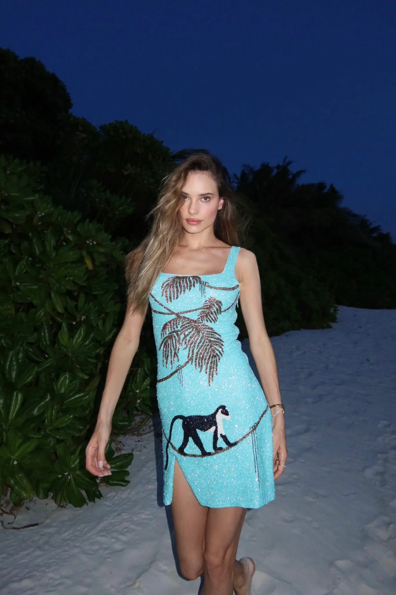 Step into a tropical reverie with the St. Barth Hand-Beaded Crystal Dress—a testament to Oceanus’s dedication to artistry and imagination. This captivating mini dress features a whimsical design of a playful monkey hidden amidst intricate vines at the hem, hand-beaded with crystal embellishments that shimmer like sunlight on water. Each piece takes 25 hours to be lovingly crafted by skilled artisans, ensuring every bead captures the essence of luxury and the spirit of the brand. With its flattering silhouette and signature Oceanus craftsmanship, this dress is your invitation to celebrate the unexpected beauty of the wild.